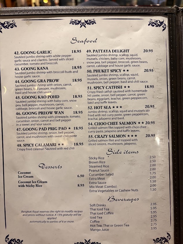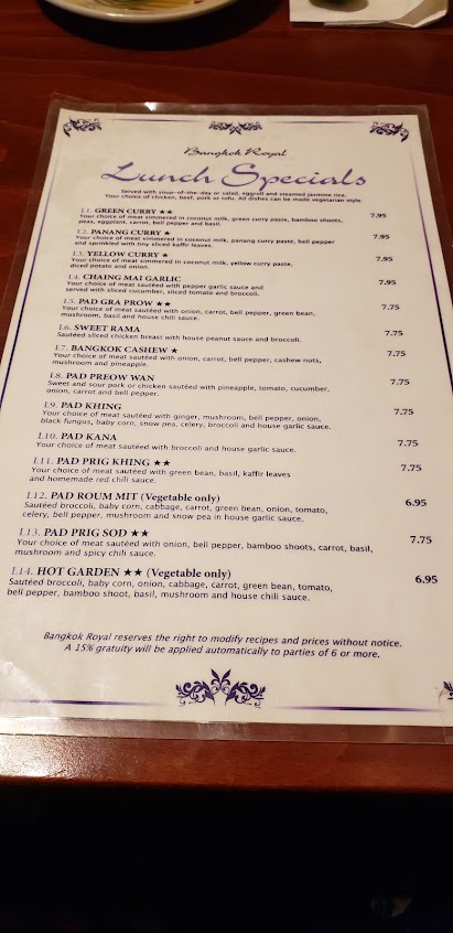 Experience the rich flavors of Thailand at Bangkok Royal in Waco, Texas. The Bangkok Royal Restaurant menu features a wide selection of authentic Thai dishes, including traditional curries, stir-fried noodles, aromatic fried rice, fresh appetizers, and vegetarian specialties. Whether you are dining in, ordering takeout, or planning delivery, you can explore the complete Bangkok Royal Restaurant menu to find your favorite Thai classics prepared with fresh ingredients and bold spices. Enjoy contemporary Thai cuisine in a comfortable atmosphere near the Waco Riverwalk.